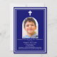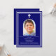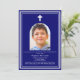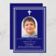 Un arrière - plan bleu marine, décoré d'un cadre blanc, et d'une croix blanche Personnalisez et ajoutez un nom photo et des détails. Texte blanc. Cadre photo en forme d'arc.