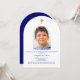 Un arrière - plan blanc, décoré d'une croix dorée Personnalisez et ajoutez un nom photo et des détails. Texte bleu marine. Cadre photo en forme d'arc. Dos : bleu marine.