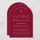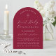 Une simple et moderne arche en forme de fille première invitation de communion. Il n'a que du texte blanc sur arrière - plan bordeaux. Dans la partie supérieure il y a une croix avec du texte voûté au-dessus. L'occasion et le nom sont écrits en script.
