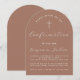 Une invitation de confirmation simple et moderne en forme d'arche, neutre en termes de genre. Il n'y a que du texte blanc sur un fond de couleur terreuse, une teinte moderne de marron. Dans la partie supérieure, il y a une croix avec du texte arqué au-dessus. L'occasion et le nom sont écrits en script.