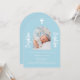 Un arrière - plan bleu clair, décoré d'une croix blanche Personnalisez et ajoutez un nom photo et des détails. Texte blanc. Cadre photo en forme d'arc.