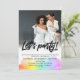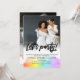 LGBT faire-part de mariage de suite pour une fête de mariage après une petite cérémonie de distance sociale. Pride suite personnalisée avec vos photos mariages, l'une de l'autre côté de l'invitation. Faisons la fête dans un script de pinceau noir en bas de votre photo.