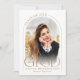 Cette carte de graduation minimaliste, en or et blanc, sert à la fois de faire-part de graduation et d'invitation à la grande fête. Elle comprend une photo, un cadre en arc et une élégante typographie moderne.