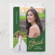 Invitez vos amis et votre famille à votre "Fête de Diplôme" avec cette invitation moderne, 2 photos, verte et dorée. Le design présente des photos avec un bord arqué. Un texte personnalisable au verso vous permet de personnaliser avec les détails de votre fête.