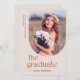 Ce carte photo moderne de remise de diplômes est doté d'une typographie élégante et d'un cadre photo en arche hors du centre. Sur le devant, "Le diplômé" est écrit dans une police simple et tendance sous la photo. Le nom du diplômé est centré sous la typographie, tandis que l'école et l'année de fin d'études du diplômé sont écrites verticalement le long du côté gauche de la photo. La typographie est orange brûlée et gris charbon de bois contre un arrière - plan de pêche léger. Le verso de la carte de graduation comprend un modèle optionnel pour ajouter les détails de la fête de graduation.