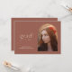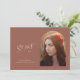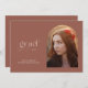 Cette faire-part moderne de graduation présente une typographie branchée et une photo en arc. Sur le devant, le mot "grad" est écrit en un type unique avec l'année de graduation ci-dessous. En bas, ajoutez le nom et l'école du diplômé. La typographie est rose pâle contre un arrière - plan rouille rouge défraîchi. A droite de la typographie, une photo en arc est affichée. Au fond, il y a un modèle pour les détails de la fête de remise des diplômes.