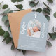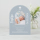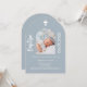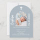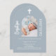 Arrière - plan bleu Dusty, décoré d'une croix blanche Personnalisez et ajoutez un nom photo et des détails. Texte blanc. Cadre photo en forme d'arc.