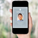Arrière - plan bleu Dusty, décoré d'un cadre blanc, et d'une croix blanche Personnalisez et ajoutez un nom photo et des détails. Texte blanc. Cadre photo en forme d'arc.