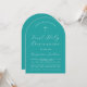 Une simple et moderne arche en forme de garçon première invitation de communion. Il n'a que du texte blanc sur l'arrière - plan turquoise. Dans la partie supérieure il y a une croix avec du texte voûté au-dessus. L'occasion et le nom sont écrits en script.