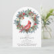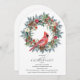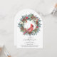 Arch-shaped invitations are one of the hottest trends in event planning. Fresh and novel, it will capture your guests' attention. An elegant red cardinal nestled in a winter greenery wreath invites guests to your winter or Christmas birthday party. The watercolor design features a beautiful cardinal and a pine wreath decorated with red flowers and berries along with pine cones.
