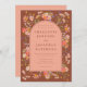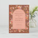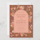 Faire carte d'invitation de mariage avec arche de fleurs sauvages élégantes aux tons orange brûlé, terre cuite et pêche. Cette invitation de mariage bohème chic enchante par son mélange saisissant de chaleur automnale et de charme élégant. Avec des fleurs sauvages peintes à la main et à l'aquarelle autour d'une arche élégante, l'invitation présente une riche palette de couleurs comprenant orange brûlé, terre de Sienne brûlée, corail, orange, marron, jaune, vert, terre cuite, corail, violet et rose. Les tons terreux chauds créent une parfaite harmonie, ce qui en fait un choix idéal pour un mariage d'automne. L'écriture élégante et la typographie moderne apportent une touche de sophistication, tandis que les aquarelles de fleurs sauvages fantaisistes autour de la fenêtre en arche ajoutent une touche personnelle et bohème à tous vos détails de mariage essentiels. Conçue par l'artiste talentueuse Catherine Sweetman, cette invitation unique incarne l'esprit d'une célébration intime et chaleureuse au cœur de l'automne. Avec des modèles faciles à personnaliser, elle offre un moyen fluide de transmettre vos informations de mariage avec style et art. Le fond en terre cuite riche,