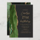 Le bord gauche de cette élégante invitation à la fête d'anniversaire moderne comporte une bordure en aquarelle vert chasseur ornée d'une fausse parties scintillant dorée. Le texte personnalisable combine un script de couleur or et des polices sans serif sur un arrière - plan noir en ardoise. L'envers est assorti d'un design d'agate vert et or.