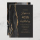 Le bord gauche de cette élégante invitation à la fête d'anniversaire moderne comporte une bordure en aquarelle noire ornée d'une fausse parties scintillant dorée. Le texte personnalisable combine un script de couleur or et des polices sans serif sur un arrière - plan noir en ardoise. L'envers est assorti d'un design d'agate noir et or.