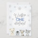 Silver Blue Arctic Winter Onederland Anniversaire Invitation pour l'anniversaire d'hiver de Sweet boy's winter onederland invitation comprenant quatre mignons animaux arctiques, une fausse calligraphie argentée en tête avec un mot d'aquarelle bleu, des flocons de neige et un paysage d'hiver en bleu. L'invitation d'anniversaire d'hiver de ce garçon à l'onederland est sûr de préparer le terrain pour la fête d'anniversaire d'un garçon à l'onederland.