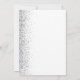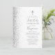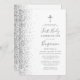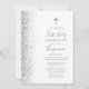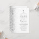 Le bord gauche de cette élégante invitation de première communion moderne comporte une bordure en faux parties scintillant argenté. Une fausse croix de feuille argent apparaît au-dessus du texte personnalisable, qui combine écriture manuscrite, copperplate et polices italiques en gris sur un arrière - plan blanc. L'envers présente un design blanc et argent assorti.