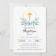Invitation Arrangement floral bleu, croix d'or baptême garçon