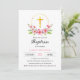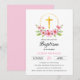 Invitation Arrangement floral rose, croix d'or baptême fille