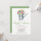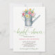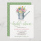 arrosage vintage avec bouquet de fleurs multicolores printemps et été faisant une élégante invitation à la douche nuptiale fleurie pastel aquarelle pastel. La carte a un arrière - plan blanc sur le devant et un motif géométrique sur un arrière - plan vert sauge (couleur modifiable) au verso. Il dispose d'un script de calligraphie sophistiqué et de lettres contemporaines modernes.— Idéal pour un extérieur, jardin printemps ou été élégant country chic douche party.