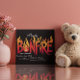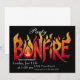 Une illustration numérique d'une invitation de fête de remise de diplôme avec des flammes de feu de joie. Un design graphique comportant le mot feu de joie rendu en lettres grasses et enflammées.