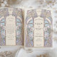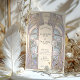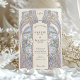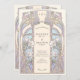 This two-sided wedding invitation features an elegant Art Nouveau frame filled with blooming magnolias, curling vines, and lily-of-the-valley motifs. Stylized whiplash curves sweep around a central ivory panel, creating a romantic architectural border reminiscent of Belle Époque posters and antique stained glass. Soft pastel tones of lilac, blush, blue, and celadon are outlined with fine, golden line work that gives the artwork a refined, heirloom quality.