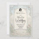 Step into a timeless romance with this enchanted garden design, featuring a soft pastel palette and intricate art nouveau details perfect for fairytale unions.This design employs a sophisticated trompe-l'œil technique to create the visual sensation of depth. The layout features a dusty blue and sage green colorway, framing a central cream space with ornate, swirling scrollwork reminiscent of early 20th-century craftsmanship. At the apex, a delicate silhouette of a couple stands beneath a faint gazebo, while the bottom foreground showcases a cobblestone path strewn with blush pink tulip petals. The typography combines elegant calligraphy for names with a whimsical hand-lettered header, balancing formal structure with storybook charm.This is a flat printed image with a faux 3D embossed relief effect, not actual raised material.