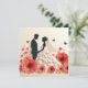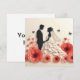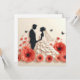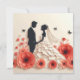 Belle illustration d'un couple en tenue de mariage sur fond de coquelicots rouges et de papillons noirs. Le couple est en silhouette, le marié en costume et la mariée en robe fluide avec une voile. La palette de couleurs générale est rouge, noir et blanc.