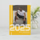 Fêtez la grande journée de votre diplômé en style avec nos invitations modernes à la fête de remise de diplômes en photo athlétique jaune. La police de couleur blanche en gras présente l'année de classe, en complément d'une photo de l'heureux diplômé. Avec un processus de personnalisation rationalisé, chaque carte incarne l'esprit unique de votre diplômé, parfait pour les athlètes de n'importe quel genre. Non seulement l'avant de la carte possède un design élégant et sobre, mais l'arrière offre également de l'espace pour un modèle de célébration personnalisé. Inoubliablement élégante, ces invitations sont le parfait envoi pour votre groupe amateur de sport.