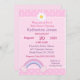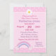 Baby shower arc-en-ciel Invitation avec une fleur blanche. et arrière - plan rose. Customisez les invitations pour les douches pour bébés avec les détails de votre fête.