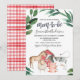 Cutes animaux de ferme rustiques et feuillage invitation au baby shower sans distinction de sexe avec une vache, un âne, un cochon et un mouton. Le dos de l'invitation est un motif plaid à l'aquarelle dessiné à la main en rouge et blanc. C'est une jolie façon d'invitation les invités à un baby shower non sexiste.