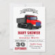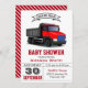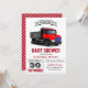 Éblouissez vos invités avec cet invitation baby shower cool doté d'un camion rouge moderne avec typographie accrocheuse contre un arrière - plan blanc. Ajoutez simplement les détails de votre événement sur ce modèle facile à utiliser pour en faire une invitation unique. Retournez la carte pour révéler un motif rayé rouge et blanc au dos de la carte.