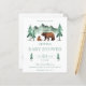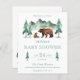 Une Invitation Baby shower Neutre Pour Les Sexes. Sur un arrière - plan blanc, on voit une aquarelle d'une mère et d'un bébé ours entourés d'arbres forestiers verts. Le texte de la typographie indique Votre nom Baby shower. Personnalisez-vous en ajoutant tous vos détails sur l'événement et les contacts.