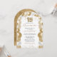 Cette élégante invitation Quinceañera présente une arche de ballons de parties scintillant scintillante dans différentes nuances de blanc et d'or avec ballon d'or 15. Des banderoles et des confettis en blanc et or complètent l'ambiance du parti. Le dos est orné d'un arrière - plan doré brillant. Facile à customiser en cliquant sur "Personnaliser".