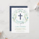 Ce baptême élégant et joli, invitation à la baptême, présente une couronne florale illustrée avec le mot "baptême" encerclant une croix. La couleur du texte, la police et le message peuvent être changés à votre goût. L'arrière du invitation est muni d'un arrière - plan de la marine (qui peut être échangé à n'importe quelle couleur de votre choix) avec un motif de carrelage blanc.