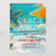 Préparez-vous à célébrer l'été avec style grâce à notre invitation de fête de plage estivale, qui présente une scène de plage vibrante et une écriture élégante pour donner le ton parfait à votre événement. Cette invitation capture l'essence d'une fête de plage animée, avec un bar de plage pittoresque, des palmiers qui se balancent et des vagues douces qui viennent lécher le rivage.