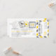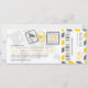 Une carte d'embarquement a inspiré l'invitation au billet avec des détails amusants de timbres de passeport et des bandes d'avion. Affiché dans les tons jaune soleil, gris foncé et gris clair. Le verso comprend un espace supplémentaire pour tout hôtel, voyage ou information sur le site Web.
