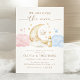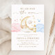 Célébrez la joie de votre arrivée à venir avec cette enchanteresse "Over the Moon" sexe révéler l'invitation! Doté d'un charmant croissant de lune qui embrasse une étoile souriante, entouré d'étoiles dorées, de nuages roses et bleus oniriques et d'une biberon douce, ce design combine à merveille et élégance. Les tons chauds et neutres et la délicate typographie de script créent un thème céleste intemporel, idéal pour votre révélation magique. Customisez facilement avec vos détails de l'événement et préparez-vous à accueillir un "il ou elle" inoubliable révélé sous les étoiles!