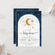 Célébrez dans un style cosmique avec cette magnifique invitation au baby shower ! 🌙 ✨ Doté d'un arrière - plan bleu foncé, d'étoiles dorées et blanches délicates, d'une lune dorée étincelante et d'un minuscule 🚀 de fusées, il donne le ton parfait à votre événement "Houston, We are Over the Moon, We Have a Boy!". Le design de l'arc ajoute de l'élégance, et il est entièrement personnalisable. 🌟 Un invitation rêvé pour votre petit !