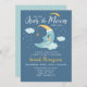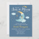 Une adorable invitation marine et baby shower de lune bleue avec une mignonne demi lune avec des nuages, des étoiles, et le dicton "Nous sommes sur la lune avec joie." Retournez notre invitation pour voir un motif étoilé bleu et blanc coordonné pour une touche spéciale supplémentaire. Conçu pour vous par Blackberry Boulevard.