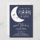 Adorable bébé sur la lune dans l'invitation baby shower d'amour. Retournez notre invitation baby shower pour voir un dos de coordination avec les étoiles bleues.