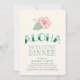 Aloha ! Organisez-vous un dîner de bienvenue de mariage à thème hawaïen ou luau avant le grand jour ? Invitez amis et famille avec nos adorables invitations de dîner de bienvenue de mariage, mettant en vedette une illustration de fleur d'hibiscus corail et verte avec "dîner de bienvenue aloha" en typographie vert émeraude. Le verso des cartes présente un motif floral tropical d'hibiscus.