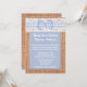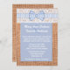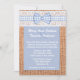 Sweet country charmantes invitations de mariage, faites dans un look burlap, avec une zone de texte bleu pâle, devant. Des graphiques en dentelle blanche et un ruban en vichy bleu et blanc clair et un arc s'étirent sur le dessus. Personnalisez le texte blanc pour votre journée spéciale. Produits mariages correspondants disponibles.