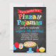 Notre invitation originale à la fête d'anniversaire à la pizza et au pajamas, à la mode Pizza & Pajamas, est l'invitation idéal pour toute soirée à thème en pizza ou en pyjama. Notre design comprend un arrière - plan en damier, un mélange de lettres motifs amusantes comme des pois, des rayures et des chevrons, une pizza sur un stand, une boisson de fête et un bol de pop-corn.