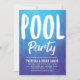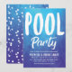Cartes d'invitation pour une fête à la piscine en bleu et blanc vibrants. Ces invitations présentent les mots pool party en grand texte blanc sur le devant. Au verso, un motif à points blancs sur le même fond bleu Tempest.