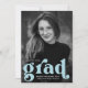 Invitations audacieuses à la fête de remise de diplômes avec la photo verticale du diplômé avec "grad" en gras bleu ciel. Personnalisez les invitations de la fête de remise de diplômes en y ajoutant le nom du diplômé, l'année de fin d'études et l'école. Les invitations de la fête de graduation bleu ciel s'inversent pour afficher les détails de votre fête.
