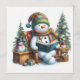Un bonhomme de neige joyeux, emmitouflé dans un chapeau et une écharpe tricotés colorés, s'installe dans un fauteuil en bois pour profiter d'un livre tranquille près de l'arbre. Entourée de touches festives — un ami bonhomme de neige miniature, des pommes de pin, des cadeaux emballés et des sapins enneigés — cette scène charmante capture la magie paisible et cosy d'un après-midi d'hiver. Parfait pour les cartes de vacances, les décorations ou pour quiconque aime une bonne histoire avec une touche de chaleur saisonnière.