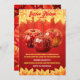 Une belle invitation avec trois délicieuses pommes confites sur un arrière - plan rouge et des feuilles d'automne. Très joli pour une fête d'automne ou d'halloween.