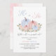Une invitation à la fête de la Reveal Genre Bébé sur le thème du citrouille. Le design automnal automne présente des citrouilles roses et bleus entourés de fleurs et de feuillage. L'élégant texte de typographie dit "Lui ou Elle" que sera notre citrouille ? Personnalisez l'édition de l'invitation numérique ou imprimée avec les détails de votre événement.