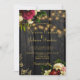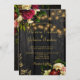 Une belle faire-part de mariage traditionnelle rustique avec des bouquets de fleurs d'automne de bordeaux foncé et roses de crème pêche et de pivoines, des cordes de lumières scintillantes et un script de calligraphie chic faux or sur un arrière - plan de bois de grange brun foncé. ++++++++++++++ L'invitation est également adapté pour la nuit d'été ou l'hiver rustique pays / jardin extérieur / ferme mariage cérémonies et réceptions.