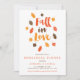 Un dîner de répétition typographique parfait pour l'automne/l'automne, avec l'expression "tomber amoureux" dans la police de caractères manuscrite de style moderne, et la chute des feuilles illustrés en orange, marron, jaune moutarde/ocre. L'invitation peut être entièrement personnalisée avec les détails de votre événement. L'inverse est en gris solide.