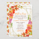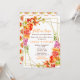 This fun and whimsical baby shower invitation features watercolor pomegranate, apples, grapes, mushrooms and foliage on a gold geometric frame. The text combines handwritten script and serif fonts for a stylish and modern look. This is perfect for a rustic autumn fall baby shower.